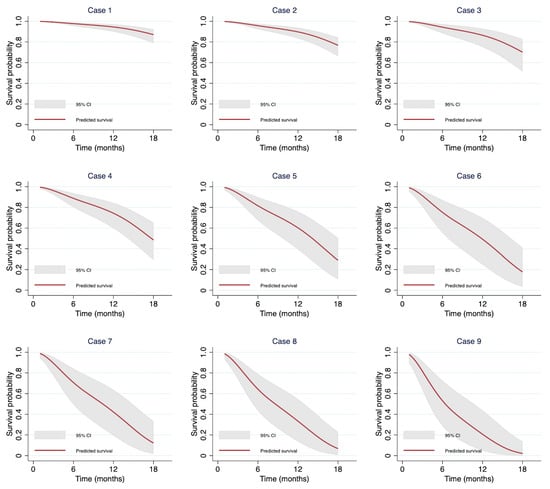 From our dataset, we selected nine patients with different combinations of predictors to illustrate survival probabilities after 6, 12, and 18 months (Table 4). Each patient had a unique combination of variables, resulting in varied survival estimates. The survival prediction curves for each patient are shown in Figure 4. Patients without any poor prognostic factors have an estimated 18-month survival rate of 87.09% (95% CI: 78.68–92.34). In contrast, those with all poor prognostic factors have an estimated 18-month survival rate of only 2.13% (95% CI: 0.60–13.85). The results were consistent in the complete case analysis (Supplementary Table S7).