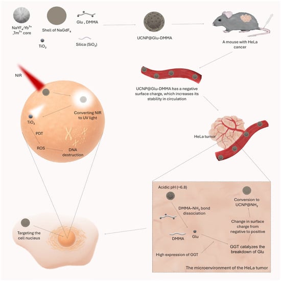 - Ling, B.; Yang, L.; Wang, C.; Dong, L.; Yang, Y.; Wang, L.; Zhang, J.; Yuan, Y. Cascade-Responsive Upconversion Nanoplatform for Efficient Cell Nucleus Targeting and Boosted Photodynamic Tumor Therapy. ACS Mater. Lett. 2024, 6, 5256–5265. [Google Scholar] [CrossRef]