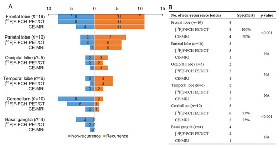 3.3. Comparison of Diagnostic Performance of [18F]F-FCH PET/CT and CE-MRI in Detecting Lesion Distributions and Sizes of Recurrent BM