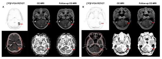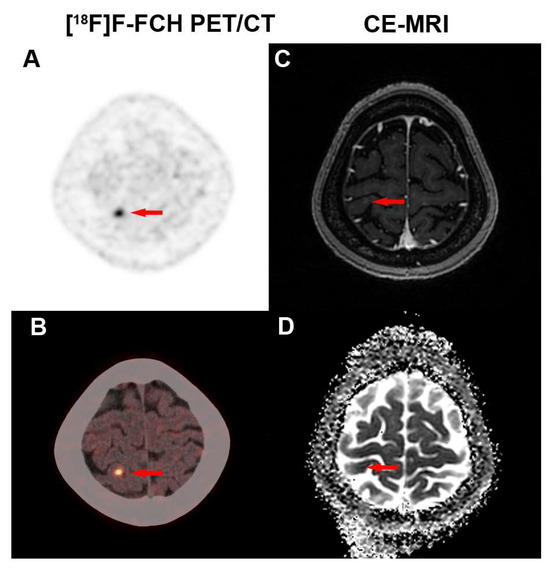 - Grkovski, M.; Kohutek, Z.A.; Schöder, H.; Brennan, C.W.; Tabar, V.S.; Gutin, P.H.; Zhang, Z.; Young, R.J.; Beattie, B.J.; Zanzonico, P.B.; et al. (18)F-Fluorocholine PET uptake correlates with pathologic evidence of recurrent tumor after stereotactic radiosurgery for brain metastases. Eur. J. Nucl. Med. Mol. Imaging 2020, 47, 1446–1457. [Google Scholar] [CrossRef] [PubMed]
