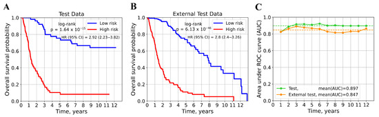 To further evaluate the predictive performance of the model, we performed a time-dependent ROC analysis by calculating the areas under the ROC curves to predict risk scores over a period of 1 to 12 years (Figure 2C). This approach allowed us to estimate how accurately the risk score determined by the model can discriminate patients who died by a specified period (e.g., 1, 2, …, 12 years) from those who remained alive. In the internal test dataset, the AUC values were 0.910 and 0.897 to predict 5- and 10-year OS, respectively, and the mean AUC value over 12 years was 0.897. In the external test dataset, the values were slightly lower but remained high: the AUCs for 5- and 10-year predictions were 0.868 and 0.830, respectively, and the mean AUC value was 0.847.