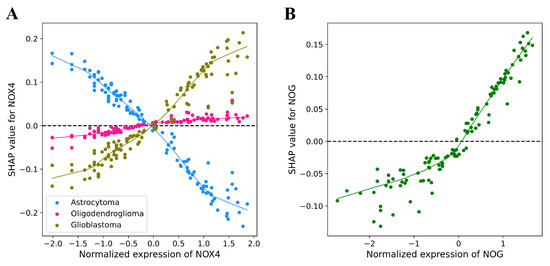 Scatterplots for the SHAP values and expression levels of the most important genes in the models. (A) Dependence of SHAP values on the expression of the NOX4 gene in the classification model for three glioma subtypes. Each patient in the test dataset corresponds to three dots, which indicate the SHAP values associated with the three glioma subtypes. Positive SHAP values for a particular class indicate that the feature value increases the probability of predicting that class, while negative values decrease it. (B) Dependence of SHAP values on the expression of the NOG gene in the model for predicting overall survival of patients with glioma. Positive SHAP values indicate that the feature value increases overall survival, while negative values decrease it.