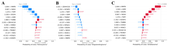 In a classification problem, the SHAP value indicated how much the probability of predicting a certain class increases (if the SHAP value is positive) or decreases (if the SHAP value is negative), depending on the observed value of the considered feature. As shown in Figure 4A, high levels of NOX4 expression increased the probability of predicting glioblastoma, as evidenced by the positive correlation between the SHAP values for the glioblastoma class and the gene expression values. Low NOX4 expression values increased the probability of predicting astrocytoma, as a negative correlation is observed between the SHAP values for the astrocytoma class and gene expression. SHAP values for the oligodendroglioma class were close to zero, indicating a minimal impact of gene expression on this tumor subtype. Analysis of the SHAP values for the remaining genes (Supplementary Figure S2) revealed that increased expression of ZDHHC18, HDAC1, and TUBB6 enhances the probability of predicting astrocytoma, while elevated expression of TERT, TRIM67, NOG, KCNIP2, and KCNJ11 increases the probability of predicting oligodendroglioma. In addition, higher expression levels of MMP9, TERT, VEGFA, ZDHHC18, CHEK2, and ADM elevate the probability of predicting glioblastoma.