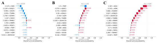 Figure 6 displays local explainability graphs of survival predictions generated by the CoxCC model for three distinct patients with glioma. The blue (red) lines correspond to features whose values decrease (increase) the survival probability. For patients who died after 450 and 1133 days, the model predicted low 12-year survival probabilities of 0.019 (Figure 6A) and 0.45 (Figure 6B), respectively. Meanwhile, for the patient who survived just over 12 years (4427 days), normalized expression levels of all genes were indicative of prolonged survival, which led the model to predict a high survival probability of 0.84 (Figure 6C).