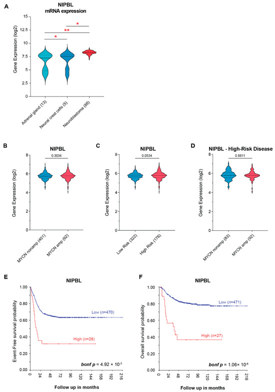 NIPBL expression is upregulated in neuroblastoma patients. (A) NIPBL mRNA expression levels across normal adrenal glands (n = 13), neural crest cells (n = 5), and primary neuroblastoma tumors (n = 88, Verteeg dataset), showing significantly increased expression in neuroblastoma patients; Welch’s two-tailed t-test. Asterisks indicate significance levels: p < 0.05 (*), p < 0.01 (**). (B) NIPBL mRNA expression in MYCN-amplified versus non-amplified neuroblastoma tumors (SEQC dataset); Welch’s two-tailed t-test. (C) NIPBL mRNA expression in low- and high-risk neuroblastoma tumors (SEQC dataset); Welch’s two-tailed t-test. (D) NIPBL mRNA expression in MYCN-amplified versus non-amplified tumors within the high-risk subgroup (SEQC dataset); Welch’s two-tailed t-test. (E) Kaplan–Meier analysis of event-free survival in neuroblastoma patients from the SEQC dataset (GSE49710), stratified into high (n = 28) and low (n = 470) NIPBL expression groups, demonstrates that high NIPBL expression is significantly associated with worse event-free survival (bonf p-value 4.92 × 10−3) (F) Kaplan–Meier analysis of overall survival in the same cohort, comparing high (n = 27) and low (n = 471) NIPBL expression groups, reveals a significant association between high NIPBL expression and poorer overall survival (bonf p-value 1.06 × 10−6). Kaplan–Meier survival analyses were performed using the R2: Genomics Analysis and Visualization Platform (http://r2.amc.nl accessed on 1 May 2025). High- and low-NIPBL expression groups were defined using the platform’s scan mode, which systematically evaluates all possible expression thresholds and selects the cutoff that yields the most statistically significant separation in survival outcomes. Survival differences were assessed using the log-rank test, and p-values were adjusted for multiple testing using the Bonferroni correction.