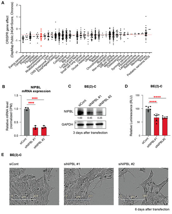 NIPBL is essential for neuroblastoma cell proliferation. (A) DepMap Chronos dependency scores across different tumor types were analyzed. A dependency score below −0.5 indicates that the target gene is essential for the survival of the cell line. Neuroblastoma cell lines are among the tumor types that show dependency on NIPBL. (B) Downregulation of NIPBL mRNA expression was confirmed with RNA-seq results from NIPBL-depleted BE(2)-C cells after 3 days of transfection. Expression levels are shown relative to siCont. Statistical significance was determined using one-way ANOVA. “****” indicates statistical significance with p < 0.0001. (C) Western blot confirming NIPBL protein depletion in BE(2)-C cells with two siRNAs. GAPDH served as a loading control. (D) CellTiter-Glo assay demonstrating significantly reduced viability of BE(2)-C cells six days after NIPBL depletion. (E) Phase-contrast images showing decreased cell confluency in BE(2)-C cells six days following NIPBL depletion.