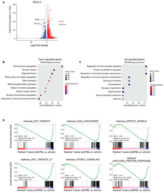 NIPBL maintains neuroblastoma oncogenic transcriptome. (A) Volcano plot showing differentially expressed genes in BE(2)-C cells transfected with siRNAs targeting NIPBL compared to control siRNA (log2 fold change > ±1.5, p-value < 0.05). Up- and down-regulated genes are represented by red and blue symbols. Genes with no significant expression change are represented by gray symbols (B) Gene Ontology (GO) enrichment analysis of downregulated genes upon NIPBL knockdown reveals strong enrichment in cell cycle–related biological processes, including DNA replication, mitosis, and chromosome segregation. (C) GO enrichment analysis of upregulated genes shows significant enrichment in neuronal differentiation–related processes such as synapse organization, axonogenesis, and trans-synaptic signaling. (D) Gene Set Enrichment Analysis (GSEA) plots show significant negative enrichment of hallmark gene sets associated with proliferation and oncogenic activity, including E2F targets, the G2M checkpoint, MYC targets, the mitotic spindle, the unfolded protein response, and mTORC1 signaling, following NIPBL depletion.