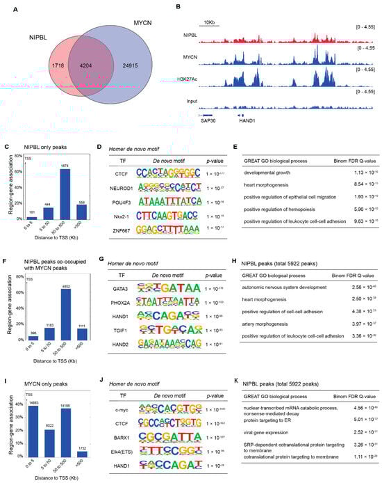 Although NIPBL is known to associate with the enhancers and promoters of cell-type-specific genes, it does not recognize specific DNA sequences on its own [27]. Instead, NIPBL colocalizes with lineage-defining transcription factors at regulatory elements [14,15,16,28]. These studies suggest that certain transcription factors can recruit NIPBL to facilitate cohesin loading at target enhancers and promoters. Given that MYCN is a key oncogenic driver in high-risk neuroblastoma and governs a broad transcriptional network, we hypothesized that NIPBL may colocalize with MYCN in the neuroblastoma genome. To test this, we performed genome-wide ChIP-seq for NIPBL and MYCN in the MYCN-amplified neuroblastoma cell line BE(2)-C. We identified 5922 NIPBL peaks, of which 4204 overlapped with MYCN peaks (Figure 4A), suggesting widespread genomic co-occupancy of NIPBL with MYCN. Representative ChIP-seq signal tracks show colocalization of NIPBL and MYCN at both the promoter and enhancers of the HAND1 gene locus (Figure 4B). GREAT analysis of peak distribution revealed that the majority of NIPBL peaks—regardless of MYCN colocalization—were enriched at distal regulatory elements, beyond ± 5 kb from transcriptional start sites (Figure 4C,F), consistent with NIPBL’s role at enhancers. De novo motif analysis using HOMER revealed distinct transcription factor motif enrichment patterns between the two categories of NIPBL peaks. NIPBL peaks not bound by MYCN were enriched for motifs of transcription factors involved in neuronal differentiation, such as NEUROD1 and POU4F3. In contrast, NIPBL peaks that overlapped with MYCN binding were significantly enriched for motifs recognized by core regulatory circuitry (CRC) transcription factors critical to neuroblastoma cell identity, including GATA3, PHOX2A HAND1, and HAND2 (Figure 4D,F) [29]. In contrast, MYCN peaks that did not colocalize with NIPBL were enriched at both promoters and distal regulatory regions and contained MYC binding motifs as well as motifs for transcription factors associated with broader developmental programs, including BARX1 and ELK4 (Figure 4J).