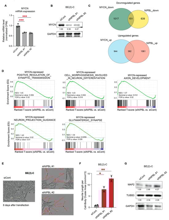 Using transcriptomic analyses of various MYCN-depleted NB cell lines, we identified gene sets representing “MYCN-activated canonical MYC targets,” including genes involved in ribosome biogenesis and RNA processing, as well as “MYCN-repressed neuronal genes,” encompassing pathways involved in neuronal morphogenesis and axon development [31]. These gene sets were used for GSEA of NIPBL-depleted RNA-seq data from BE(2)-C cells, which showed significant positive enrichment of MYCN-repressed gene sets associated with synaptic transmission, neuronal morphogenesis, and axon development (Figure 5D). These findings support a functional role for NIPBL in repressing neuronal differentiation programs through regulating MYCN expression.