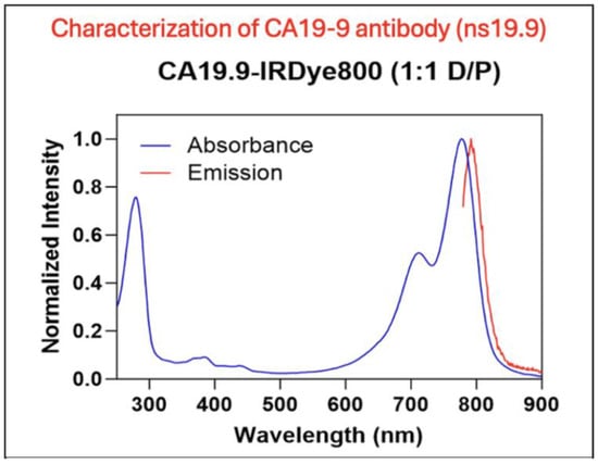 The CA19-9–IRDye800CW antibody–dye conjugate was analyzed on a spectrophotometer. The excitation and emission profiles of the molecule are shown in Figure 1. CA19-9-IRDye800CW had an excitation peak at 775 nm and an emission peak at 792 nm. The conjugate demonstrated a dye-to-protein ratio of 1.1.