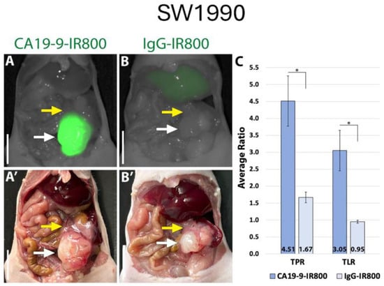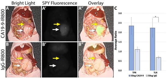 SW1990 cell line orthotopic mouse model of pancreatic cancer labeled with 50 µg CA19-9-IRDye800CW. (A) Bright light image, (A′) SPY fluorescence, and (A″) color overlay modes on the Stryker 1688 laparoscopic imaging device identifying tumors with clear margins after administration of 50 µg CA19-9-IRDye800CW. (B) Bright light image, (B′) SPY fluorescence, and (B″) overlay modes on the Stryker 1688 laparoscopic imaging device with no specific targeting after 50 µg IgG-IRDye800CW administration. White arrow: tumor, yellow arrow: normal pancreas. Scale bar: 1 cm, * = p-value < 0.05.