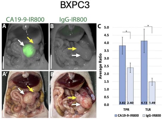 CA19-9-IRDye800CW brightly targets pancreatic cancer cell line BxPC3 in orthotopic mouse models. (A) NIR and (A’) bright light imaging of pancreatic tumor labeled with 50 µg CA19-9-IRDye800CW. (B) NIR and (B’) bright light imaging of pancreatic tumor and non-specific labeling with 50 µg IgG-IRDye800CW. (C) Average tumor-to-pancreas ratios (TPRs) and tumor-to-liver ratios (TLRs) of those treated with CA19-9-IRDye800CW or IgG-IRDye800CW. White arrow: tumor, yellow arrow: normal pancreas. Scale bar: 1 cm, * = p-value < 0.05.