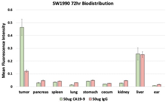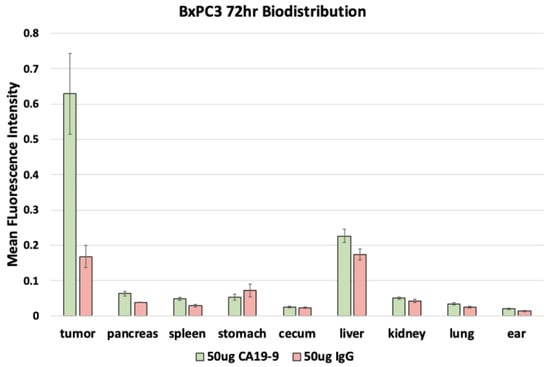 Fluorescence biodistribution of anti-CA19-9-IRDye800CW (n = 6) and IgG-IRDye800 (n = 4) in different organs of the orthotopic BxPC3 pancreatic cancer cell line mouse models.