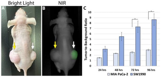 (A) Bright light and (B) NIR imaging of subcutaneous pancreatic cancer tumors. The CA19-9-negative MIA PaCa-2 tumor in the left flank was not targeted and showed no fluorescence (yellow arrow). CA19-9-IRDye800CW brightly targeted the CA19-9-positive SW1990 tumors in the right flank (white arrow). (C) Average TBRs of subcutaneous SW1990 and MIA PaCa-2 tumors over time after tail vein injection of 50 µg CA19-9-IRDye800CW. The highest TBR for the SW1990 tumors was at 96 h (* p = 0.04).