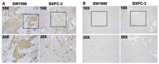 Immunohistochemical staining of CA19-9 expression in xenografts of indicated cell lines. Serial sections were incubated with (A) NS19-9 (2 µg/mL) or (B) IgG (2 µg/mL) at 4 °C followed by peroxidase labeled secondary antibody and subsequent detection of signal using DAB substrate (Vector Universal Staining KitVector Laboratories, Inc., Newark, CA, USA). Images taken at 10× and 20× are provided. The 20× images correspond to regions outlined by boxes in the respective 10× images.