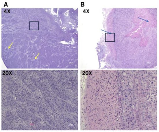 Microscopic images of poorly differentiated pancreatic ductal adenocarcinoma with H&E staining. (A) BxPC3 cell line; predominately sheets and nests of infiltrating tumor with focal glandular differentiation, yellow arrows (4×). High power view of poorly differentiated tumor cells with prominent nucleoli and abundant mitosis (20×). (B) SW1990 cell line; poorly differentiated pancreatic ductal adenocarcinoma with areas of necrosis, blue arrows (4×). High power view of pleomorphic tumor cells and adjacent necrosis (20×). The 20× images correspond to regions outlined by boxes in the respective 10× images.