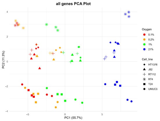 Figure 1 shows a principal component analysis (PCA) of the cell line data (6 cell lines, 4 oxygen levels, 3 replicates per condition). This is based on differential gene expression at 55.7% (PC1) on x-axis separation of samples into normoxic on the right, with samples exposed to 1%, 0.2% and 0.1% O2 on the left broadly clustering with decreasing O2 concentration (although with some overlap). Cell line differences are apparent with 11.3% (PC1) with the NMIBC cell line RT4 at the top; next is RT112, with some co-clustering with HT1376 and J82, and then with UMUC3 and T24 clustering at the bottom of the y-axis. There was a separation between the NMIBC (RT4, RT112) and MIBC (HT1376, J82, T24, UMUC3) cell lines.