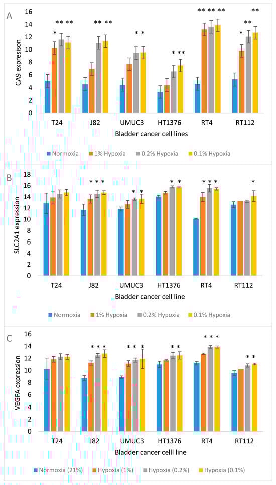 Expression of known hypoxia-associated genes, CA9 (A), SLC2A1 (B) and VEGFA (C) in bladder cancer cell lines incubated for 24 h in 21% (control), 1%, 0.2% and 0.1% O2. Significant differences from control * p < 0.05, ** p < 0.01.