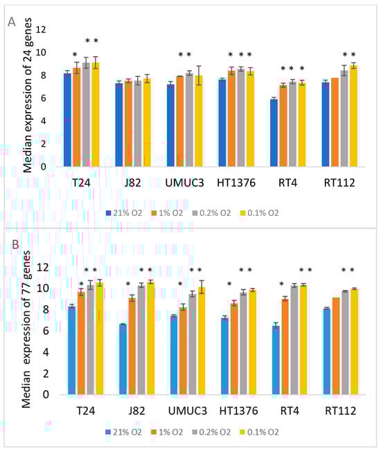 Sensitivity of gene expression-based hypoxia scores HS24 (A) and the median expression of 77 genes upregulated in at least 3 cell lines (HS77) (B) in bladder cancer cell lines incubated for 24 h in 21% (control), 1%, 0.2% and 0.1% O2. Significant differences from control * p < 0.05.
