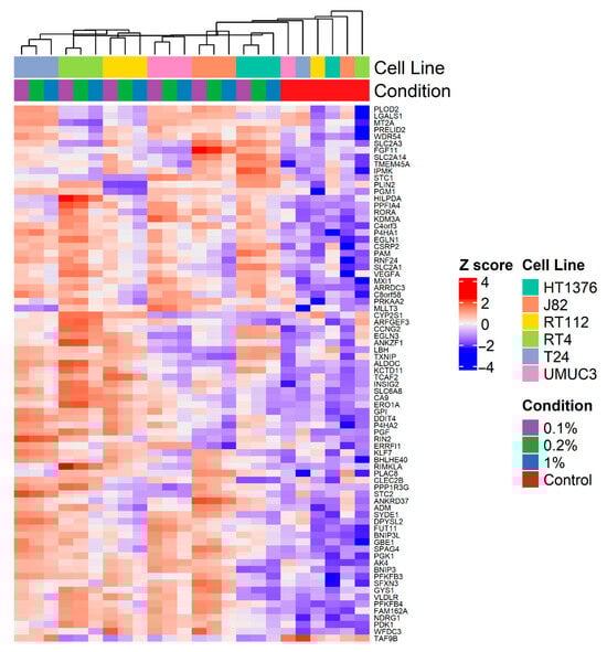 Two significance levels were used to select upregulated genes depending on the application. Biomarker development requires stringent inclusion criteria to reduce misdiagnosis. To derive biomarker candidate gene panels, we used padj < 0.001 to select genes up- or downregulated by hypoxia to reduce the false positive rate (FDR). However, using tight criteria for identifying differentially upregulated genes between two disease subtypes may miss important genes, so a less stringent significance level (FDR), padj < 0.05, was used to identify genes differentially regulated by hypoxia in MIBC and NMIBC cell lines.