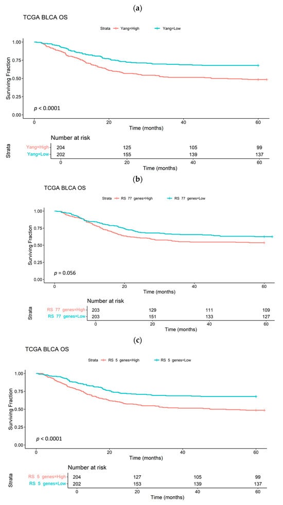 Kaplan–Meier survival curves for patients with bladder cancer in the TGCA-BLCA cohort (n = 408) stratified by median expression of a 24-gene signature (a), 77 genes upregulated in at least 3 bladder cancer cell lines exposed to 0.1% O2 (b) or 5 genes common to a and b (c).