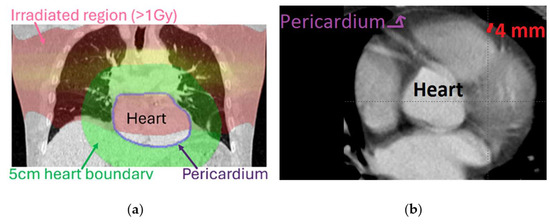 Outside the field of RT, studies have shown that pericardial sac abnormalities are early predictors of cardiac death [14,15,16,17,18,19]. Within the field of RT, studies have shown correlations between dose to pericardium and mortality risk [20,21]. Historically, the most prevalent and earliest RT-induced cardiotoxicity signs are radiation-induced pericardial changes [22,23]. However, the pathophysiological stages of RT-induced pericardial diseases are not well understood. Probably because the pericardium is an encompassing structure, the risk of pericardial disease has been found to be correlated with dose to various cardiac structures, including whole heart, right and left atrium, and the pericardium itself [4]. Once pericardial toxicity becomes clinically relevant (or symptomatic), it is usually associated with an unfavorable prognosis [16]. Pericardial diseases have gained new clinical interest and are being revisited in several recent studies [24,25,26]. On a CT, the normal pericardium is seen as a thin (≤2 mm) line of fibrous tissue, a small amount of fluid (between 15 and 50 mL), and some fat. While differences between normal and variant pericardial anatomy can be subtle, they could be important early markers for later CVD [18,27]. Although assessing pericardial health has been recommended as a part of clinical practice for identifying patients at greater risk of developing CVD [28,29], to our knowledge, no widely or routinely used clinical protocol has been reported, especially for cancer patients.