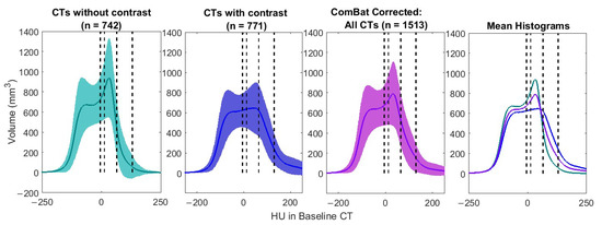 Figure 2 shows ComBat results for 1513 baseline images. These were the baseline images from the original 1751 patient set, excluding images in which the whole heart was not captured. Figure 3 shows ComBat results for the HU histograms (variation and mean) of both baseline and follow-up images from the main 476 patients.