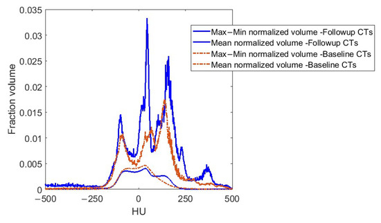 Histogram of pericardial Hounsfield units (HUs) in the 476 baseline and follow-up images in this study after application of deformable image registration and harmonization. Volumes are normalized (divided by pericardium volume), i.e., the y axis is a fraction volume of the pericardium. Solid lines = maximum minus minimum values across patients. Dashed lines = mean values across patients.