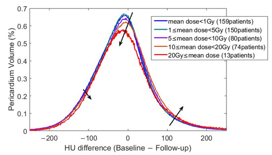 This biomarker showed the extent of HU changes for most pericardial voxels and whether there was a dose-dependency. Mean volume per HU change and per dose were calculated as: