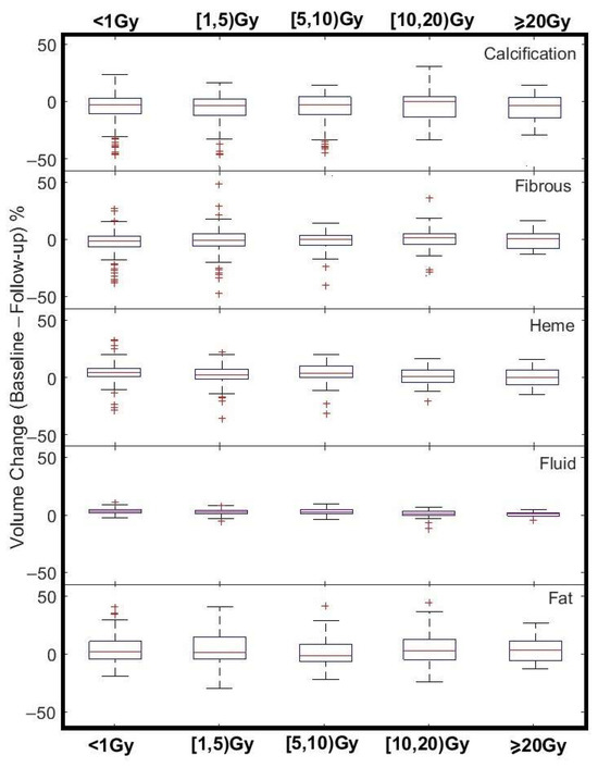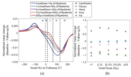 Figure 5 shows (Equation (2)) analysis. In Figure 5b, composition-based values were calculated using the HU ranges in Table 2. All normalized mass changes in HU range associated with one tissue composition (e.g., Calcification) in Figure 5a were summed up to generate Figure 5b. Dose correlation p values were <0.05 for Fibrous, Heme, and Fluid HU ranges.