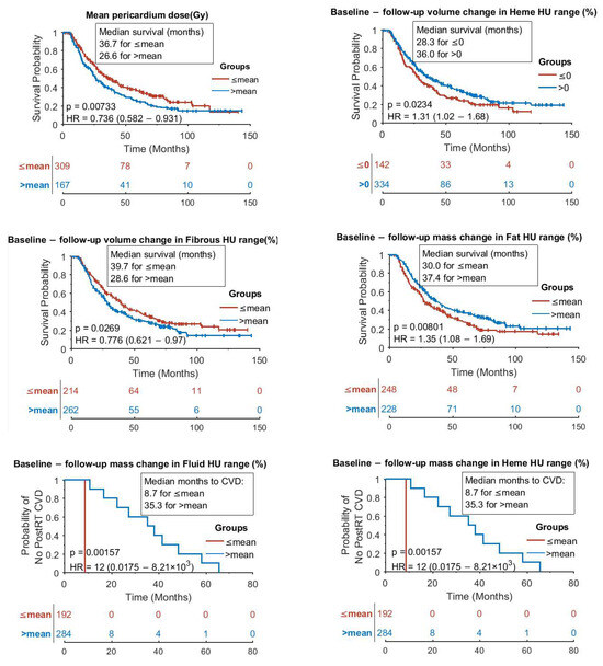 Kaplan–Meier curves in Figure 7 show that longer patient survival was significantly correlated with pericardial mass decrease in Fat, volume decrease in Heme, and volume increase in Fibrous HU ranges, whereas longer time to a post-RT CVD diagnosis was highly correlated with pericardial mass decrease in Fluid and Heme HU ranges. These findings agree well with studies that show poor prognoses in lung cancer patients with constrictive (fibrous and thickened) pericarditis and pericardial effusion (with various fluid compositions including blood) [17,22,36,47,48,49,50]. It should be noted that fat-related results could be confounded by overall weight change in cancer patients. Again, note that the 4 mm contour included some myocardial tissue with HU values within Fibrous HU range. This explains why the larger volume in the Fibrous HU range was associated with longer survival: the larger fibrous volume could be a result of a thinner pericardium with more myocardial tissue detected within the Fibrous range. Furthermore, patient sex, mean heart dose, cardiac diagnoses prior to RT, and mean pericardium dose were highly correlated with patient survival (Appendix D and Figure 7). The probability of post-RT CVD diagnoses was also highly correlated with the histogram of HU change in the whole heart (Appendix D), suggesting that a similar analysis in cardiac substructures other than the pericardium could result in clinically relevant findings.