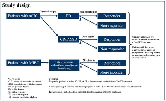 We defined the “nonresponder group” as patients who had disease progression within 6 months after the initiation of ICI treatments and the “responder group” as those who had SD, PR, or CR > 6 months after the initiation of the ICI treatments. We explored the differences and the profile of urine miRNAs between the “nonresponder” and “responder” groups.