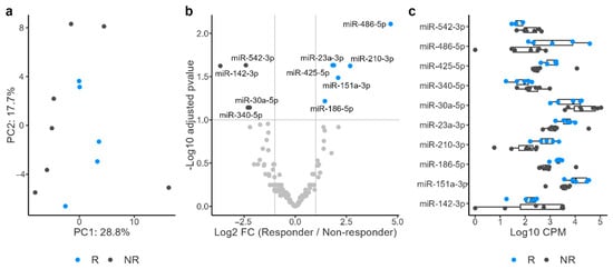 Principal component analysis of microRNA (miRNA) profiles revealed a clear separation between responders (R) and nonresponders (NR) (a). Differential expression analysis identified six miRNAs upregulated in R and four miRNAs upregulated in NR (b,c).