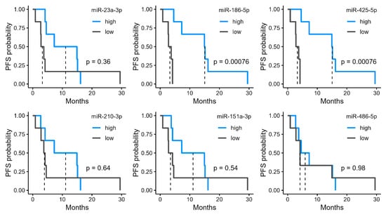 Progression-free survival (PFS) stratified by urinary microRNA (miRNA) levels upregulated in responders (R). Kaplan–Meier curves of PFS in patients grouped into high and low expression by median levels of six urinary miRNAs identified as significantly upregulated in R.