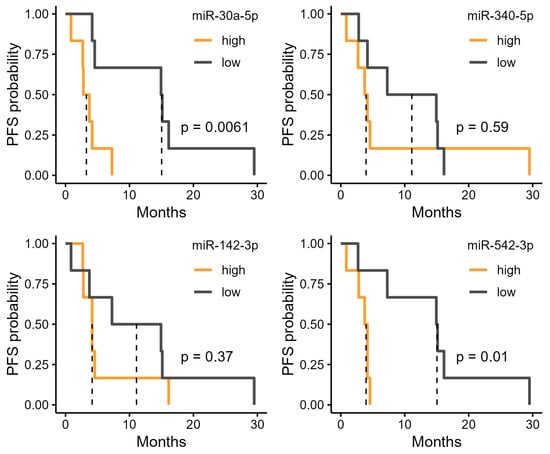We investigated the potential of the six miRNAs that were upregulated in the R group (Figure 2b) as biomarkers. High expression levels of miR-186-5p and miR-425-5p were significantly associated with longer PFS (Figure 3). In the high-expression group of miR-186-5p, the median PFS was 15.0 months, compared with 3.27 months in the low-expression group. Similarly, the high-expression group of miR-425-5p had a median PFS of 15.0 months, whereas it was 3.27 months in the low-expression group. We also examined the relationship between PFS and the four miRNAs upregulated in the NR group. Among these, miR-30a-5p and miR-542-3p showed significant differences in PFS (Figure 4). In the high-expression group of miR-30a-5p, the median PFS period was 3.27 months, compared with 15.0 months in the low-expression group (Figure 4). Similarly, the high-expression group of miR-542-3p had a median PFS of 3.95 months, whereas the low-expression group had a median PFS of 15.0 months (Figure 4).