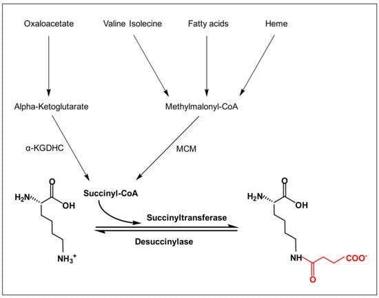 Non-enzymatic succinylation is mainly regulated by changes in the levels of succinyl-CoA, the major succinyl donor [5]. The succinyl-CoA production process can be divided into two parts (Figure 1). The main source of succinyl-CoA is the TCA cycle [14], as the oxidative decarboxylation of α-ketoglutarate catalyzed by the alpha-ketoglutarate dehydrogenase complex (α-KGDHC) generates succinyl-CoA [15]. Earlier, it was also found that the catabolism of valine, isoleucine, and leucine also generates succinyl-CoA as part of branched-chain amino acid metabolism. The β-oxidation of odd-chain fatty acids produces propionyl coenzyme A, which is converted into succinyl-CoA by propionyl coenzyme A carboxylase and methylmalonyl coenzyme A mutase (MCM) [16]. In addition, the catabolism of heme to biliverdin, catalyzed by heme oxygenase (HO), also releases succinyl-CoA [17].