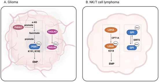 The function of succinylation in glioma and lymphoma. The figure shows succinylation occurring in glioma and nasal-type extranodal natural killer/T-cell lymphoma. Figure created using BioRender.com (accessed on 9 August 2025).
