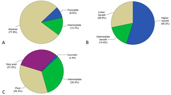 As shown in Figure 1A, according to ELN2022, 10/117 (8.5%) patients were classified as favorable, 16/117 (13.7%) as intermediate, and 91/117 (77.8%) as adverse.