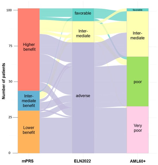 Both mPRS and ELN2022 were available for 108 patients. Within the favorable risk group, according to ELN2022 (n = 9), eight patients (88.9%) were classified as higher benefit according to mPRS and the remaining patient was classified as intermediate benefit. Of the 15 ELN2022 intermediate risk patients, 10 patients (66.7%) were classified as higher benefit and 5 (33.3%) as intermediate benefit. The adverse risk category according to ELN2022 (n = 84) was divided into 40 patients with higher benefit (47.6%), 9 patients with intermediate benefit (10.7%), and 35 patients with lower benefit (41.7%). See Figure 2.