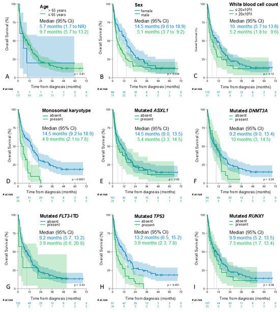 Kaplan–Meier estimates of overall survival by the single factors according to AML60+. (A) age, (B) sex, (C) white blood cell count, (D) monosomal karyotype, (E) mutated ASXL1, (F) mutated DNMT3A, (G) FLT3-ITD mutation, (H) mutated TP53 and (I) mutated RUNX1.