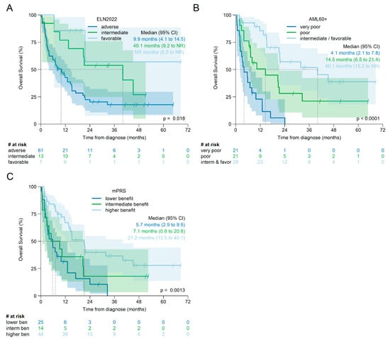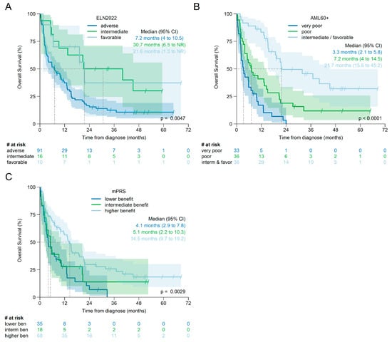 Patients were classified according to ELN2022 [3] and according to mPRS [13,14]. The AML60+ score was calculated as described by Versluis et al. [18]. Components and risk groups of the AML60+ score are shown in the Supplementary Table S1A,B.