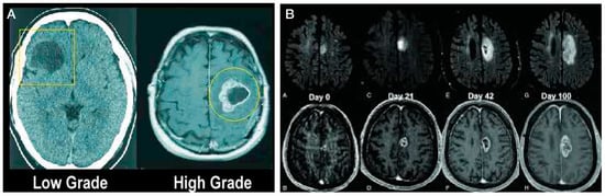 Cerebral gliomas may be either low grade (Grades I–II) or high grade (Grades III–IV) (Figure 1A), with higher grade tumors often growing rapidly over the course of only a few months (Figure 1B). They are characterized by microvascular development, with tumor arteries providing a plentiful blood source to aid the rapid proliferation of tumor cells []. Glioblastomas are further characterized by areas of necrosis, which typically are encircled by cancer cells. Because of glioblastoma tumor rapid expansion, these necrotic areas have localized oxygen deficiency as a consequence of the tumor’s rapid expansion.