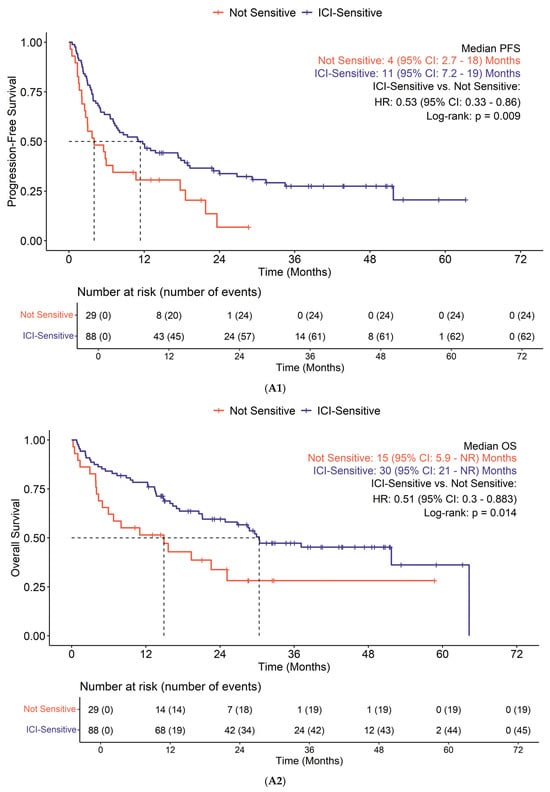 A total of 88 patients (75%) were considered ICI-sensitive (Group 1), while 29 (25%) were considered non-ICI-sensitive (Group 2). Median TMB value for ICI-sensitive patients was 21.1 mut/Mb (IQR: 13.4–42.2 mut/Mb), compared to 15.0 mut/Mb (IQR: 11.4–22.8 mut/Mb) for non-ICI-sensitive patients. PD-L1 CPS expression level was positive in 46% and negative in 39% of patients.