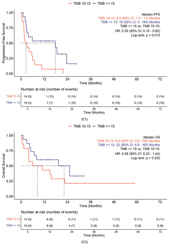 In the Keynote-158 trial, response rates for tumors varied by TMB: 6.7% for TMBs < 10 mut/Mb, 12.5% for 10–13 mut/Mb, and 37% for >13 mut/Mb. This suggests the 10 mut/Mb cutoff is ineffective for distinguishing responders [16]. This threshold was established based on earlier retrospective studies involving patients with NSCLC [64]. However, numerous studies conducted since then suggest that a reevaluation of appropriate, potentially cancer-type-specific TMB cutoffs is necessary to improve patient selection for those most likely to benefit from ICIs [24,65]. In our study, 60% of patients demonstrated a TMB ≥ 15 mut/Mb. However, evaluating the entire patient population, this elevated TMB was not linked to enhanced survival outcomes. Conversely, within the subgroup of patients who were non-sensitive to ICIs, those with a TMB ≥ 15 mut/Mb exhibited significantly improved survival compared to individuals with TMB values ranging from 10 to 15 mut/Mb. The optimal TMB threshold remains unclear, though establishing one optimal cutoff in heterogenous tumor types with variable tumor microenvironments may not be possible. Further studies to identify optimal cutoffs, particularly focusing on specific tumor types, are warranted.