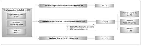 The study population comprised 191 randomly chosen adult individuals from the ImV-HOng study (controls, n = 58; patients n = 133). The CONSORT-Flowchart of participants is shown in Figure 1. The distribution between controls and patients is similar to that of the original ImV-HOng study. A total of 90 (67.7%) patients with myeloid and 43 (32.3%) patients with lymphoid neoplasms were included.