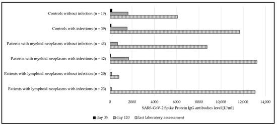 Median anti-spike IgG at day 35, day 120, and at last laboratory assessment, compared between subgroups with and without SARS-CoV-2 infections. Significant differences could be seen in both patient groups (myeloid p = 0.02; lymphoid p < 0.001). In the group of controls, significance was not reached (p = 0.2).