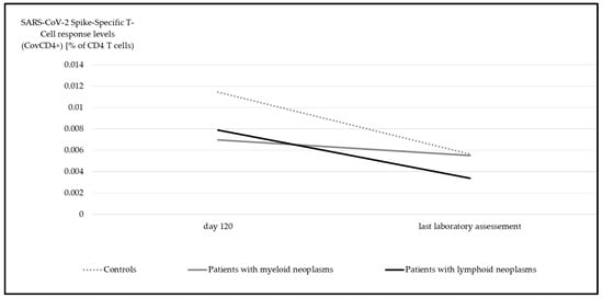 Median SARS-CoV-2 spike-specific T-cell response (CovCD4+) at day 120 and at last laboratory assessment. Significant differences were detectable in all groups (myeloid p = 0.04, lymphoid p < 0.001, controls p = 0.004, Wilcoxon test).