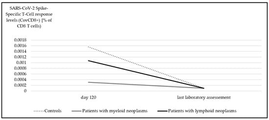 Median SARS-CoV-2 spike-specific T-cell response (CovCD8+) at day 120 and at last laboratory assessment. Significant differences were detectable in all subgroups (myeloid p < 0.001, lymphoid p = 0.001, controls p < 0.001, Wilcoxon test).