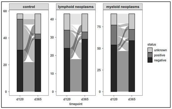 The design of the ImV-HOng study (OSHO#98, DRKS00027372) was previously published [4,5]. In brief, the trial was a longitudinal, prospective, multicenter, non-interventional study which compared day-35 (d35) and day-120 (d120) vaccine-elicited spike protein-specific humoral and d120 T-cell responses between patients with hematologic malignancies and controls. The original trial was conducted from 17 March 2021 to 6 December 2021 across seven centers of the East German Study Group for Hematology and Oncology (OSHO).