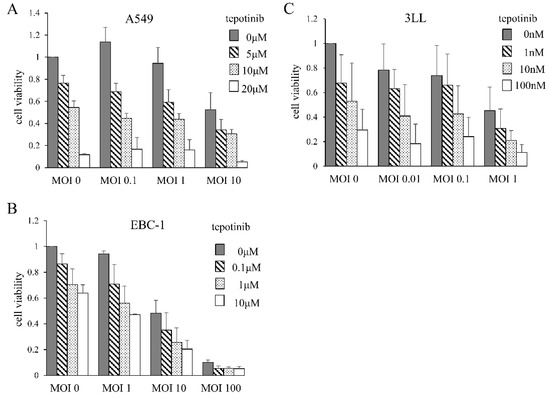 Cytotoxic effects of MDRVV and tepotinib on lung cancer cell lines. Cells were cultured for 3 days with varying concentrations of MDRVV and/or tepotinib, and then cell numbers were counted. Cell viability was calculated with neither MDRVV nor tepotinib as 1.0. (A) A549: human lung adenocarcinoma cell line. (B) EBC-1: human lung squamous cell line. (C) 3LL: mouse lung adenocarcinoma cell line. MOI: multiplicity of infection.